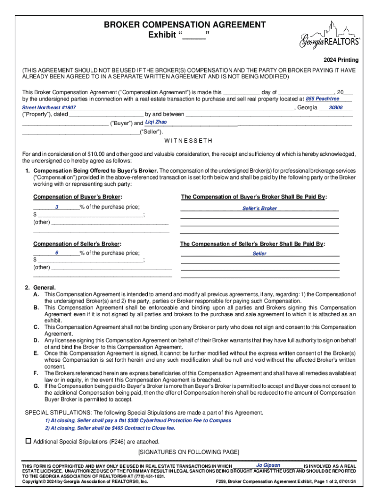 BROKER COMPENSATION AGREEMENT Exhibit ___ 2024 Printing (THIS AGREEMENT SHOULD NOT BE USED IF THE BROKER(S) COMPENSATION AND THE PARTY OR BROKER PAYING IT HAVE ALREADY BEEN AGREED TO IN A SEPARATE WRITTEN AGREEMENT AND IS NOT BEING MODIFIED) This Broker Compensation Agreement (Compensation Agreement) is made this ___ day of ___, 20___ Peachtree by the undersigned parties in connection with a real estate transaction to purchase and sell real property located at 855 ___ Street Northeast