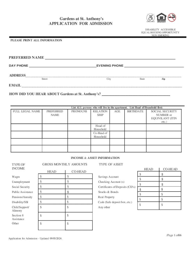 Get the free Gardens at St. Anthony's APPLICATION FOR ADMISSION