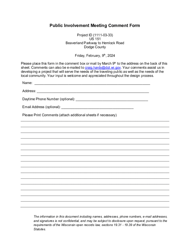 Many users encounter common concerns when working with the US 151 Comment Form. One frequent issue is understanding the specific requirements for comments. It’s essential to read any guidelines provided carefully, as this influences how effectively your feedback is integrated into transportation planning.