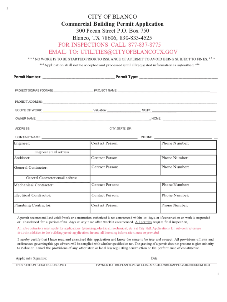 1CITY OF BLANCO Commercial Building Permit Application 300 Pecan Street P.O. Box 750 Blanco, TX 78606, 8308334525 FOR INSPECTIONS CALL 8778378775 EMAIL TO: UTILITIES@CITYOFBLANCOTX.GOV * * * NO WORK IS TO BE STARTED PRIOR TO ISSUANCE OF A PERMIT TO AVOID BEING SUBJECT TO FINES. * * * ***Application shall not be accepted and processed until all requested information is submitted. *** Permit Number: ___ Permit Type: ___ PROJECT SQUARE FOOTAGE:PROJECT NAME:__PROJECT ADDRESS: ___ SCOPE OF WORK:...