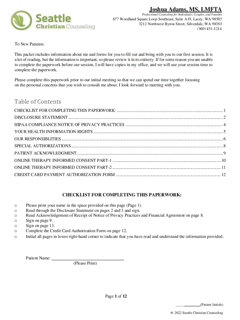 Filling out the form accurately is paramount, as it can impact the progression of treatment and the quality of care. The target audience for the Joshua Adams MS LMFTA form includes therapists, counselors, and clients seeking mental health services, all of whom benefit from a well-structured document that clarifies expectations and outlines treatment logistics.