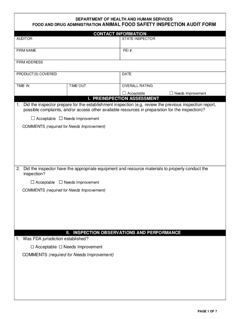 DEPARTMENT OF HEALTH AND HUMAN SERVICES FOOD AND DRUG ADMINISTRATION ANIMAL FOOD SAFETY INSPECTION AUDIT FORMCONTACT INFORMATION AUDITORSTATE INSPECTORFIRM NAMEFEI #FIRM ADDRESS PRODUCT(S) COVERED TIME INDATE TIME OUTOVERALL RATING Acceptable Needs Improvement I. PREINSPECTION ASSESSMENT 1. Did the inspector prepare for the establishment inspection (e.g. review the previous inspection report, possible complaints, and/or access other available resources in preparation for the
