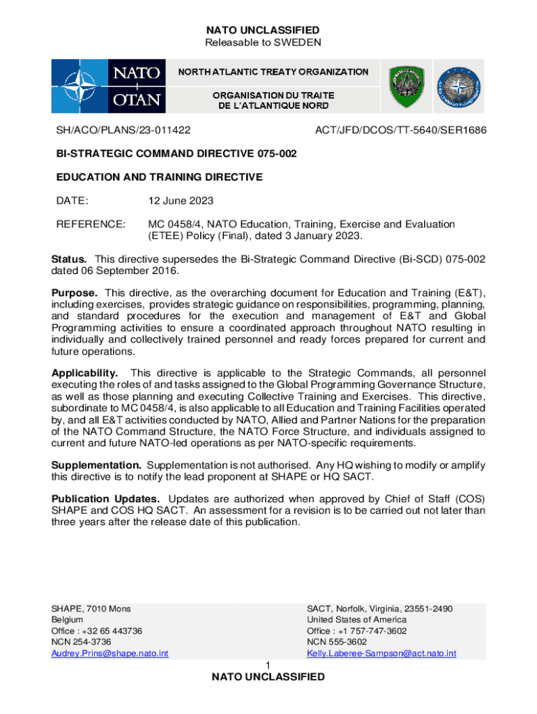 NATO UNCLASSIFIED Releasable to SWEDENSH/ACO/PLANS/23011422ACT/JFD/DCOS/TT5640/SER1686BISTRATEGIC COMMAND DIRECTIVE 075002 EDUCATION AND TRAINING DIRECTIVE DATE:12 June 2023REFERENCE:MC 0458/4, NATO Education, Training, Exercise and Evaluation (ETEE) Policy (Final), dated 3 January 2023.Status. This directive supersedes the BiStrategic Command Directive (BiSCD) 075002 dated 06 September 2016. Purpose. This directive, as the overarching document for Education and Training (E&T), including