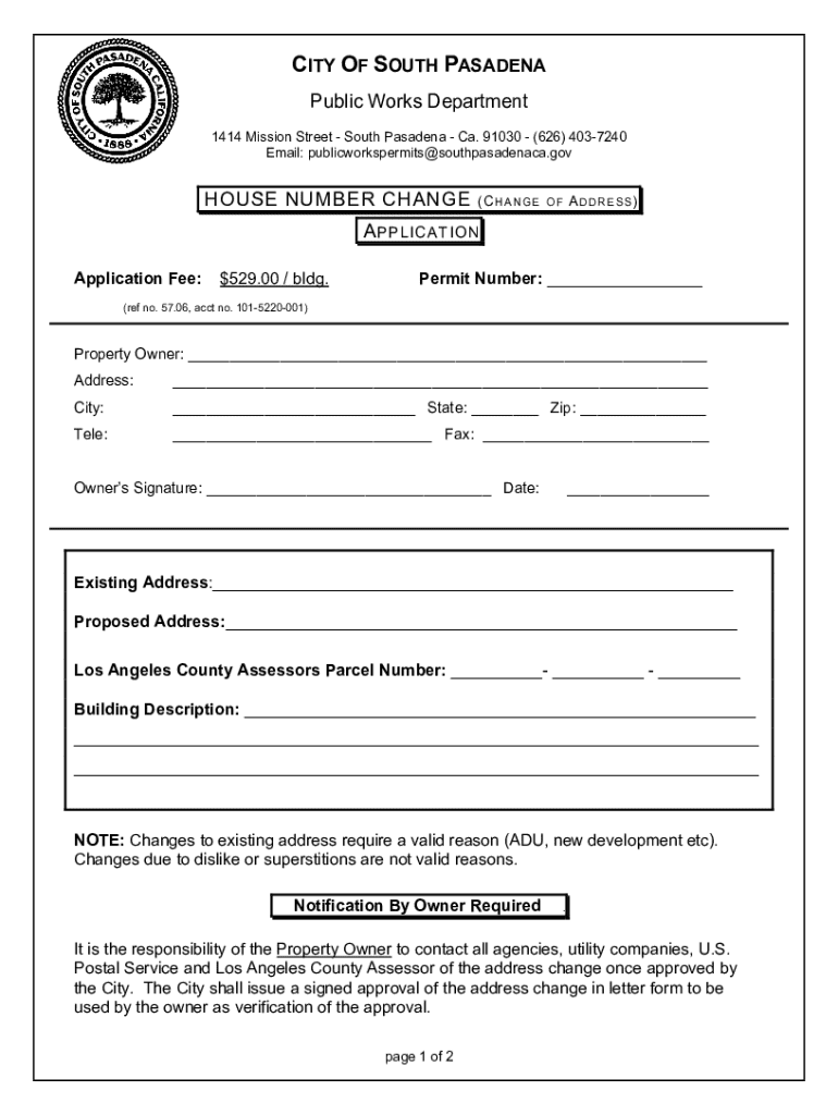 CITY OF SOUTH PASADENA Public Works Department 1414 Mission Street South Pasadena Ca. 91030 (626) 4037240 Email: publicworkspermits@southpasadenaca.govHOUSE NUMBER CHANGE(C H A N G EOFADDRESS)A PPLICATION