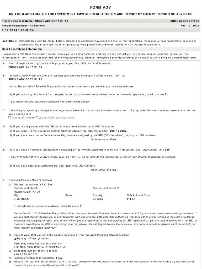 FORM ADV UNIFORM APPLICATION FOR INVESTMENT ADVISER REGISTRATION AND REPORT BY EXEMPT REPORTING ADVISERS Primary Business Name: ADELIS ADVISORY III ABCRD Number: 317936Annual Amendment All SectionsRev.
