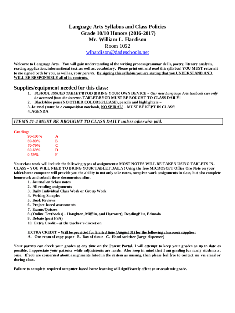 An effective language arts syllabus should contain several key elements, including course objectives, a detailed outline of topics, grading policies, and required materials. It is also helpful to include classroom rules and communication expectations to ensure a clear understanding of course dynamics.