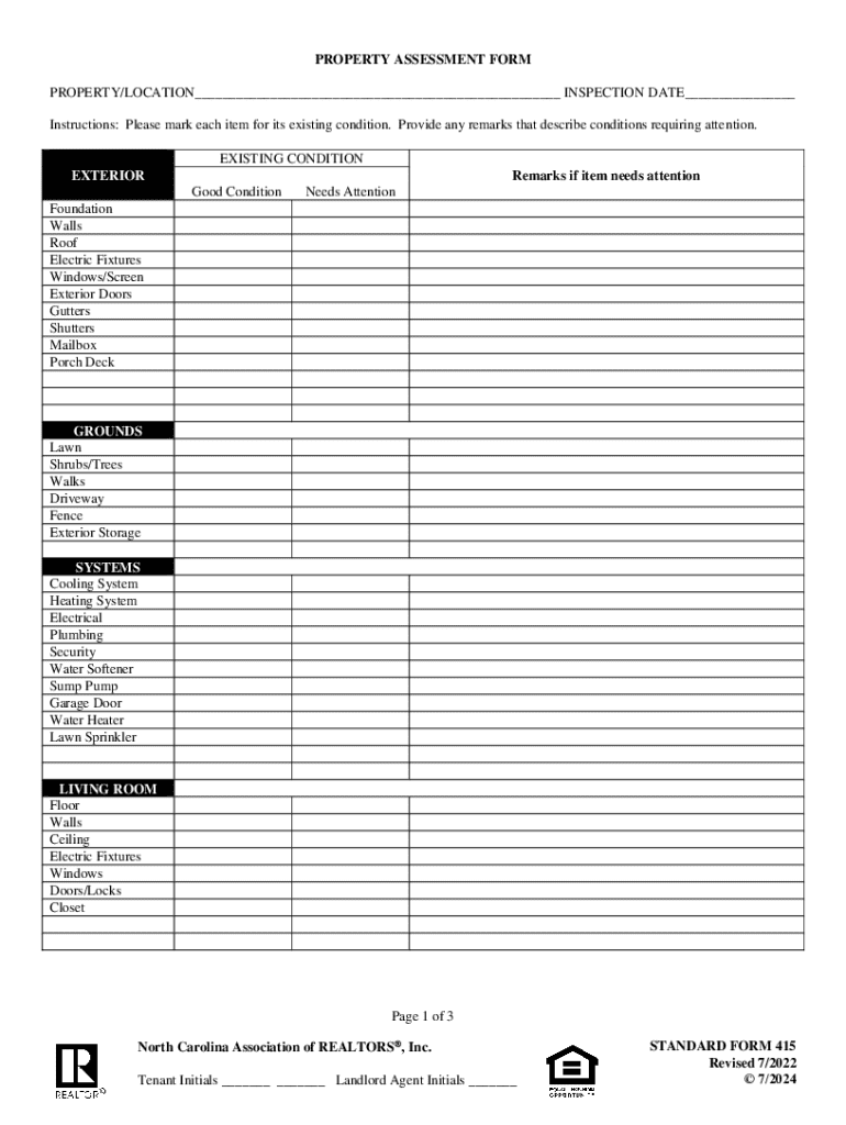 PROPERTY ASSESSMENT FORM PROPERTY/LOCATION___ INSPECTION DATE___ Instructions: Please mark each item for its existing condition. Provide any remarks that describe conditions requiring attention. EXISTING