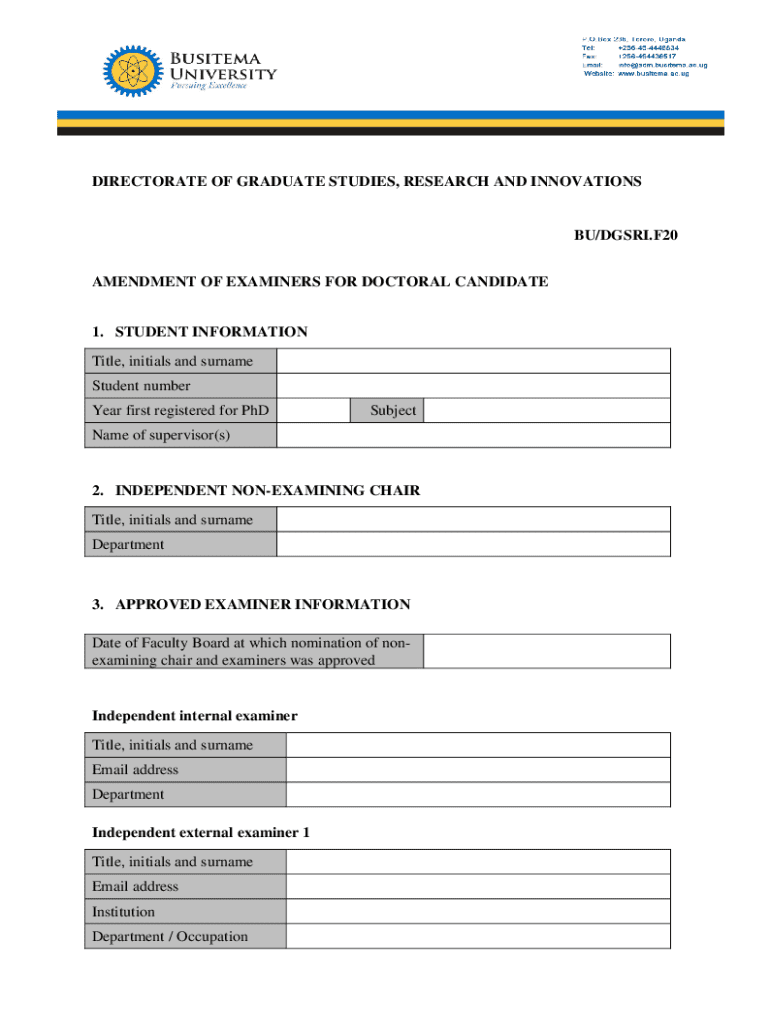 DIRECTORATE OF GRADUATE STUDIES, RESEARCH AND INNOVATIONSBU/DGSRI.F20 AMENDMENT OF EXAMINERS FOR DOCTORAL CANDIDATE1. STUDENT INFORMATION Title, initials and surname Student number Year first registered for PhDSubjectName of supervisor(s)2. INDEPENDENT NONEXAMINING CHAIR Title, initials and surname Department3. APPROVED EXAMINER INFORMATION Date of Faculty Board at which nomination of nonexamining chair and examiners was approvedIndependent internal examiner Title, initials and surname Email