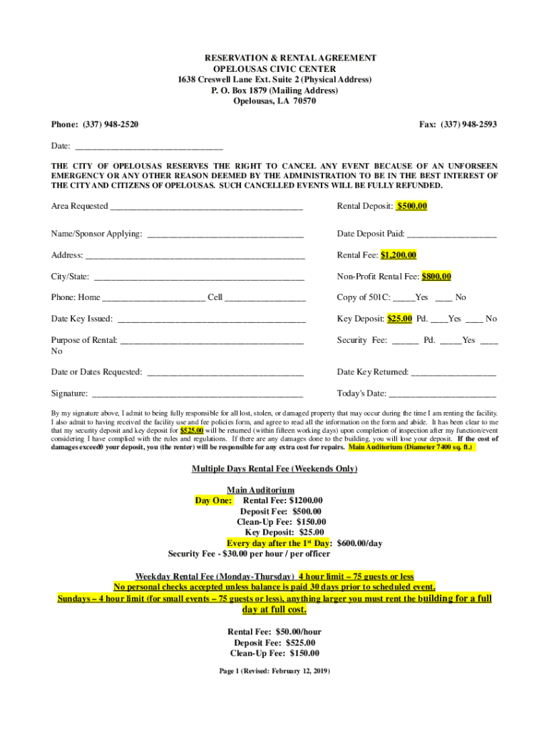 Get the free O.C.C. Rental Agreement Revised February 2019