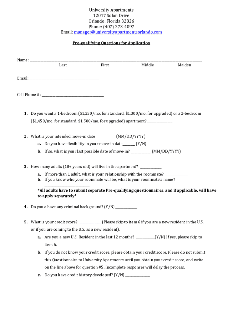 University Apartments 12017 Solon Drive Orlando, Florida 32826 Phone: (407) 2734097 Email: manager@universityapartmentsorlando.com Prequalifying Questions for ApplicationName: ___ Last First Middle Maiden Email: ___Cell Phone #: ___1. Do you want a 1bedroom ($1,250/mo. for standard, $1,300/mo. for upgraded) or a 2bedroom ($1,450/mo. for standard, $1,500/mo. for upgraded) apartment? ___ 2. What is your intended movein date___ (MM/DD/YYYY) a. Do you have flexibility in your movein date___ (Y/N) b