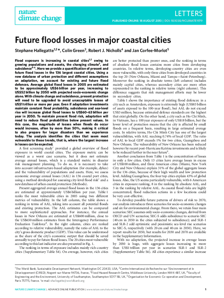 LETTERS PUBLISHED ONLINE: 18 AUGUST 2013 | DOI: 10.1038/NCLIMATE1979Future flood losses in major coastal cities Stephane Hallegatte1,2 *, Colin Green3 , Robert J. Nicholls4 and Jan CorfeeMorlot5 Flood exposure is increasing in coastal cities1,2 owing to growing populations and assets, the changing climate3 , and subsidence46 . Here we provide a quantification of present and future flood losses in the 136 largest coastal cities. Using a new database of urban protection and different...
