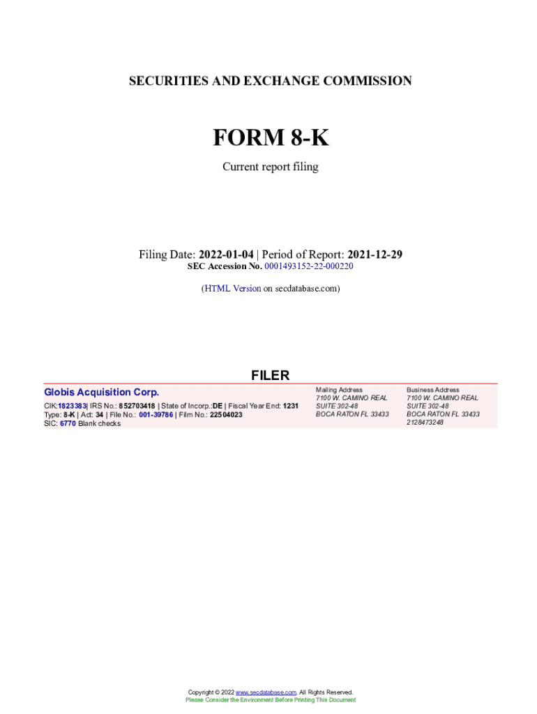 SECURITIES AND EXCHANGE COMMISSIONFORM 8K Current report filingFiling Date: 20220104 | Period of Report: 20211229 SEC Accession No. 000149315222000220 (HTML Version on secdatabase.com)FILER Globis Acquisition Corp. CIK:1823383| IRS No.: 852703418 | State of Incorp.:DE | Fiscal Year End: 1231 Type: 8K | Act: 34 | File No.: 00139786 | Film No.: 22504023 SIC: 6770 Blank checksMailing Address 7100 W. CAMINO REAL SUITE 30248 BOCA RATON FL 33433Copyright 2022 www.secdatabase.com