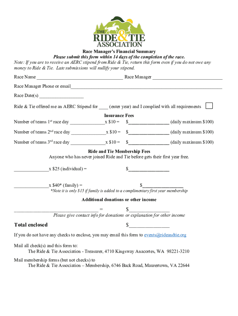 Get the free Race Manager's Financial Summary - Ride & Tie