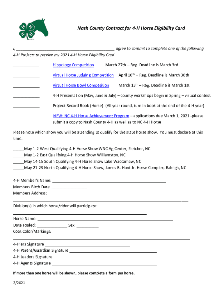 Get the free Nash County Contract for 4-H Horse Eligibility Card