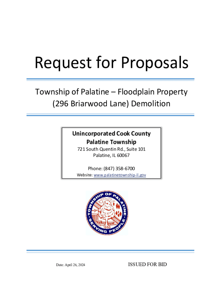 Request for Proposals Township of Palatine Floodplain Property (296 Briarwood Lane) Demolition Unincorporated Cook County Palatine Township 721 South Quentin Rd., Suite 101 Palatine, IL 60067 Phone: