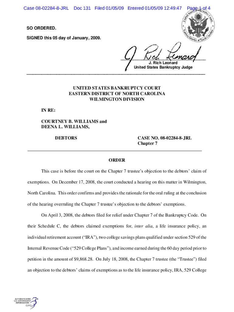Case 08022848JRLDoc 131 Filed 01/05/09 Entered 01/05/09 12:49:47Page 1 of 4SO ORDERED. SIGNED this 05 day of January, 2009.___ J. Rich Leonard United States Bankruptcy Judge___ UNITED STATES BANKRUPTCY COURT EASTERN DISTRICT OF NORTH CAROLINA WILMINGTON DIVISION IN RE: COURTNEY B. WILLIAMS and DEENA L. WILLIAMS, DEBTORSCASE NO. 08022848JRL Chapter 7 ___ ORDER This case is before the court on the Chapter 7 trustees objection to the debtors claim of exemptions. On December 17,