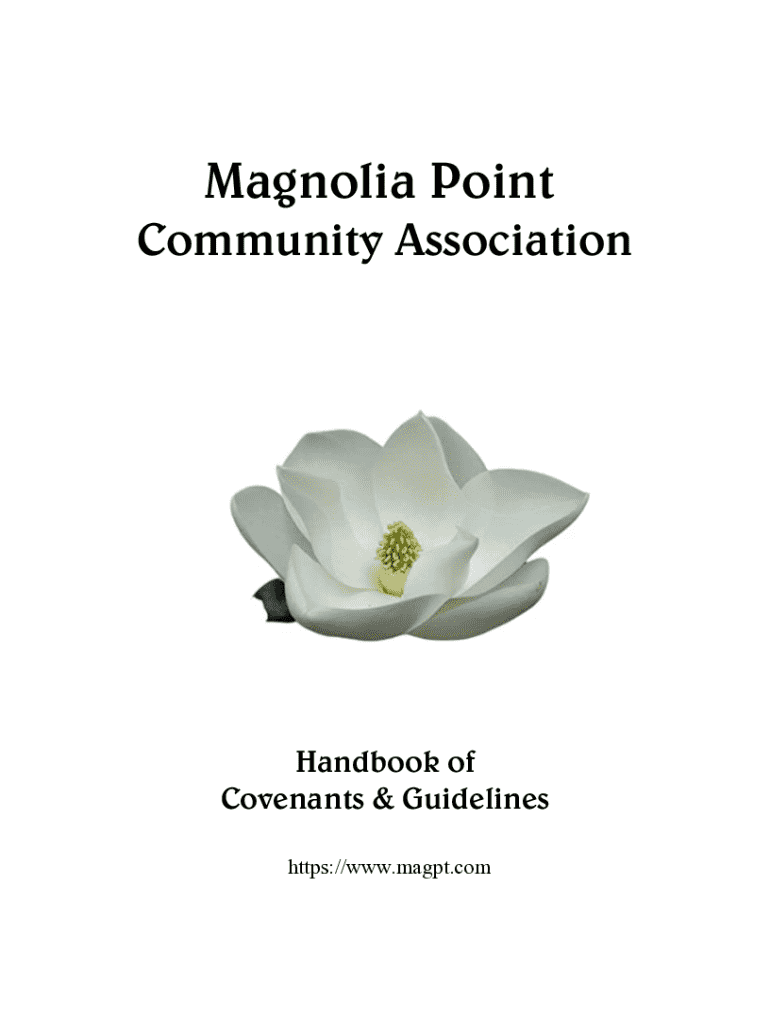 Magnolia PointCommunity AssociationHandbook of Covenants & Guidelines November 2019https://www.magpt.comwww.MagPt.comMAGNOLIA POINT COMMUNITY ASSOCIATION, INC. Community Handbook of Covenants and Guidelines (UpdatedJuly July 30, Updated 24,2018) 2024Introduction THIS HANDBOOK CLARIFIES AND SUMMARIZES portions of the Magnolia Point Community\'s extensive Declarations of Covenants, Conditions, Easements, and Restrictions and its Architectural Guidelines in one document for ease of homeowner...