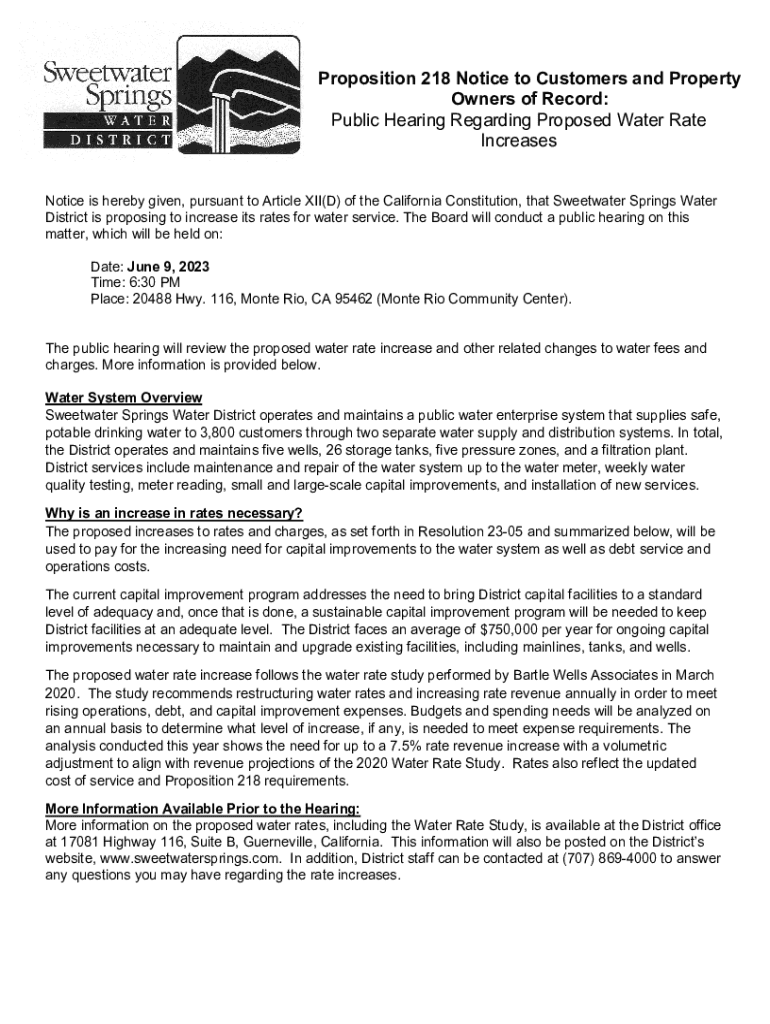 Proposition 218 Notice to Customers and Property Owners of Record: Public Hearing Regarding Proposed Water Rate Increases Notice is hereby given, pursuant to Article XII(D) of the California Constitution, that Sweetwater Springs Water District is proposing to increase its rates for water service. The Board will conduct a public hearing on this matter, which will be held on: Date: June 9, 2023 Time: 6:30 PM Place: 20488 Hwy. 116, Monte Rio, CA 95462 (Monte Rio Community Center). The public...