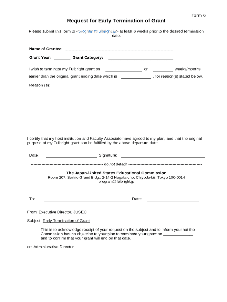 The -06 Early termination is a document needed to be submitted to the required address to provide some information. It must be filled-out and signed, which is possible manually in hard copy, or with a particular software e. g. PDFfiller. It lets you complete any PDF or Word document right in the web, customize it depending on your requirements and put a legally-binding electronic signature. Once after completion, the user can easily send the -06 Early termination to the relevant receiver, or multiple ones via email or fax. The template is printable too thanks to PDFfiller feature and options offered for printing out adjustment. Both in digital and in hard copy, your form will have got clean and professional look. Also you can save it as the template to use it later, without creating a new file from scratch. All that needed is to amend the ready form.