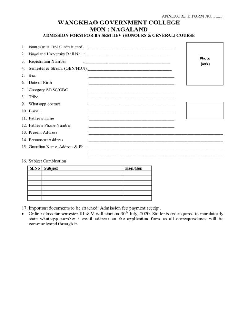 ANNEXURE 1: FORM NO...........WANGKHAO GOVERNMENT COLLEGE MON : NAGALAND ADMISSION FORM FOR BA SEM III/V (HONOURS & GENERAL) COURSE 1. Name (as in HSLC admit card) :___ 2. Nagaland University Roll No. :___ 3. Registration Number:___4. Semester & Stream (GEN/HON):___Photo (4x3)5. Sex: ___6. Date of Birth: ___7. Category ST/SC/OBC: ___8. Tribe: ___9. Whatsapp contact: ___10. Email: ___11. Fathers name: ___12. Fathers Phone Number: ___13. Present Address: ___14