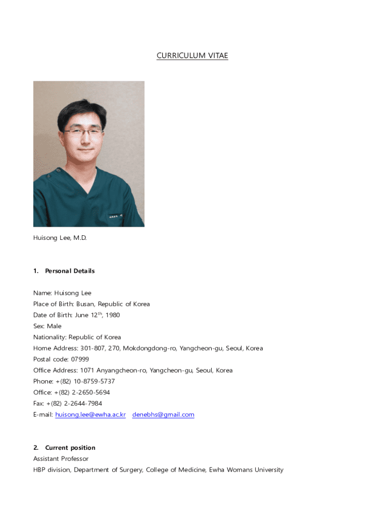CURRICULUM VITAEHuisong Lee, M.D.1. Personal Details Name: Huisong Lee Place of Birth: Busan, Republic of Korea Date of Birth: June 12th, 1980 Sex: Male Nationality: Republic of Korea Home Address: