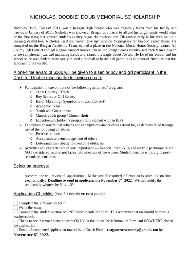 Instructions for the form Nicholas Doub, Class of 2011, was a Reagan High Senior who was tragically taken from his family and friends in January of 2011