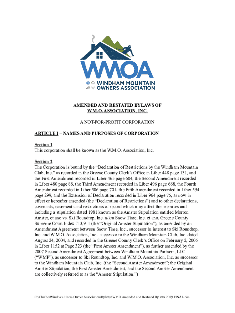 AMENDED AND RESTATED BYLAWS OF W.M.O. ASSOCIATION, INC. A NOTFORPROFIT CORPORATION ARTICLE I NAMES AND PURPOSES OF CORPORATION Section 1 This corporation shall be known as the W.M.O. Association, Inc. Section 2 The Corporation is bound by the Declaration of Restrictions by the Windham Mountain Club, Inc. as recorded in the Greene County Clerks Office in Liber 448 page 131, and the First Amendment recorded in Liber 465 page 604, the Second Amendment recorded in Liber 480 page 88, the