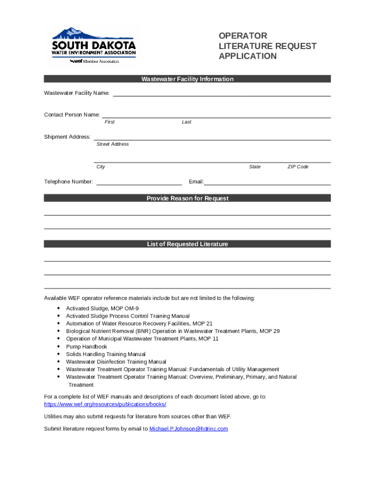 The attached - sd water & wastewater association is a fillable form in MS Word extension that can be completed and signed for specified reasons. In that case, it is furnished to the actual addressee in order to provide specific details and data. The completion and signing is able in hard copy or with an appropriate solution like PDFfiller. These services help to fill out any PDF or Word file online. It also allows you to customize it according to your requirements and put legit digital signature. Once you're good, you send the attached - sd water & wastewater association to the respective recipient or several of them by email and even fax. PDFfiller provides a feature and options that make your Word template printable. It has different options for printing out. It doesn't matter how you will distribute a form after filling it out - in hard copy or by email - it will always look well-designed and firm. In order not to create a new document from the beginning all the time, make the original file into a template. Later, you will have a customizable sample.