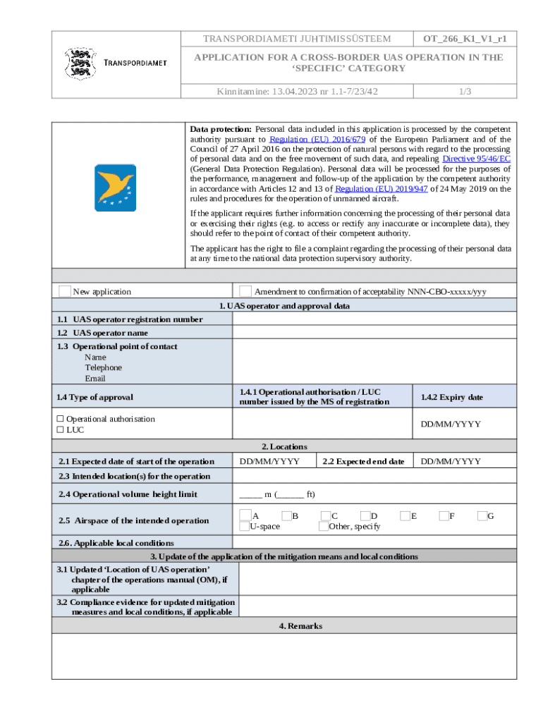 The Personal data will be processed for the purposes of the perance, management and follow-up of the application by the competent authority in accordance with Articles 12 and 13 of Regulation (EU) 2019/947 of 24 May 2019 on the rules and procedures f is a fillable form in MS Word extension that should be submitted to the required address to provide some info. It needs to be completed and signed, which can be done manually in hard copy, or by using a particular software such as PDFfiller. This tool helps to fill out any PDF or Word document right in the web, customize it according to your needs and put a legally-binding e-signature. Right away after completion, the user can easily send the Personal data will be processed for the purposes of the perance, management and follow-up of the application by the competent authority in accordance with Articles 12 and 13 of Regulation (EU) 2019/947 of 24 May 2019 on the rules and procedures f to the appropriate receiver, or multiple individuals via email or fax. The template is printable as well because of PDFfiller feature and options proposed for printing out adjustment. Both in electronic and in hard copy, your form should have a clean and professional outlook. You can also turn it into a template to use later, without creating a new blank form again. You need just to edit the ready form.