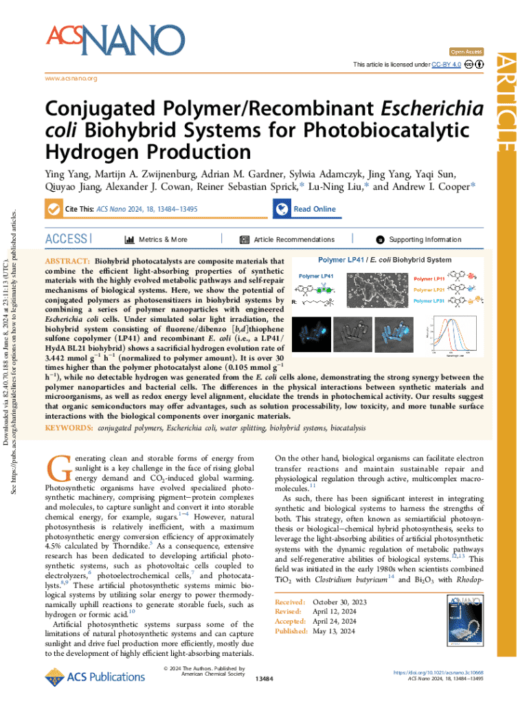 Conjugated Polymer/Recombinant Escherichia coli Biohybrid Systems for Photobiocatalytic Hydrogen Production Downloaded via 82.40.70.188 on June 8, 2024 at 23:11:13 (UTC). See https://pubs.acs.org/sharingguidelines for options on how to legitimately share published articles.Ying Yang, Martijn A. Zwijnenburg, Adrian M. Gardner, Sylwia Adamczyk, Jing Yang, Yaqi Sun, Qiuyao Jiang, Alexander J. Cowan, Reiner Sebastian Sprick,* LuNing Liu,* and Andrew I. Cooper* Cite This: ACS Nano 2024, 18,...