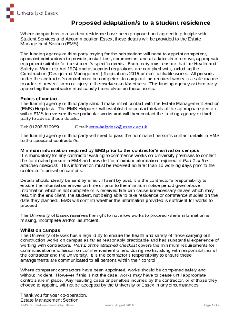 The Proposed adaptations to student residences for contractors is a document that has to be completed and signed for specified reasons. Next, it is provided to the exact addressee in order to provide certain details and data. The completion and signing is possible in hard copy by hand or via a suitable tool e. g. PDFfiller. These tools help to fill out any PDF or Word file without printing them out. It also allows you to customize it according to your requirements and put a valid electronic signature. Once you're good, you send the Proposed adaptations to student residences for contractors to the recipient or several of them by mail and even fax. PDFfiller offers a feature and options that make your document of MS Word extension printable. It has a variety of options for printing out. It does no matter how you'll file a form - in hard copy or by email - it will always look neat and clear. In order not to create a new editable template from the beginning all the time, turn the original document into a template. After that, you will have a rewritable sample.