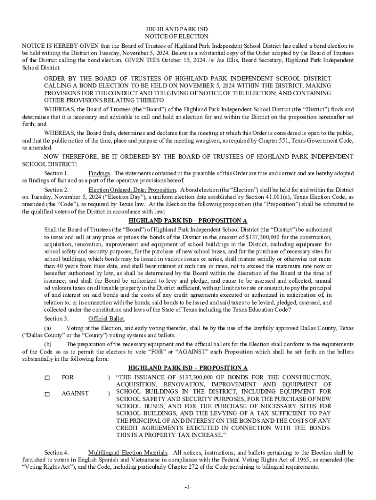 Get the free NOTICE OF BOND ELECTION NOTICE IS HEREBY GIVEN ...