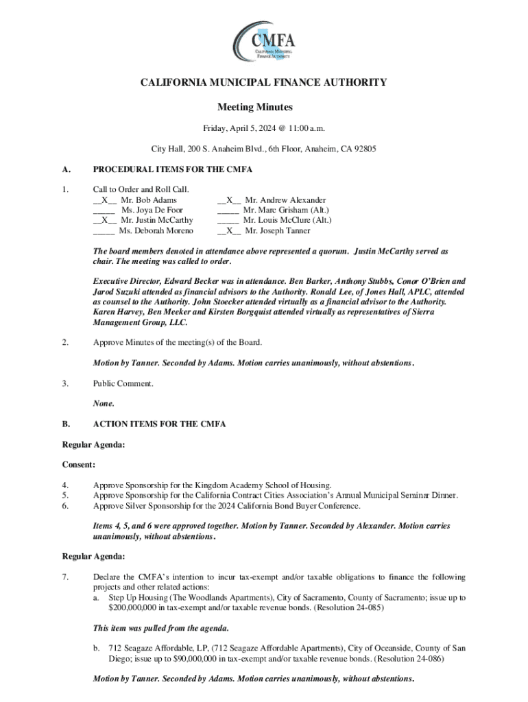 CALIFORNIA MUNICIPAL FINANCE AUTHORITY Meeting Minutes Friday, April 5, 2024 @ 11:00 a.m. City Hall, 200 S. Anaheim Blvd., 6th Floor, Anaheim, CA 92805 A.PROCEDURAL ITEMS FOR THE CMFA1.Call to Order