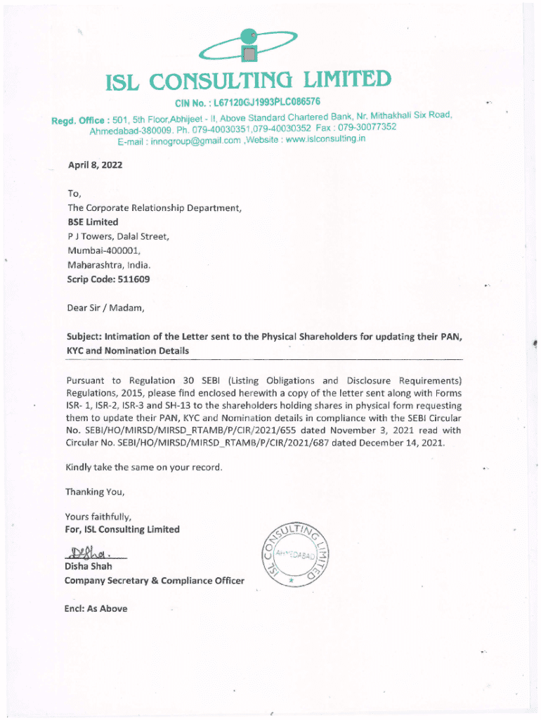 cP ISL CONSULTING LIMITED CIN No.: L67120GJ1993PLC086576....Regd. Office: 501, 5th Floor,Abhijeet II , Above Standard Chartered Bank, Nr. Mithakhali Six Road , Ahmedabad380009. Ph. 07940030351,07940030352 Fax: 07930077352 Email : innogroup@gmail.com ,Website : www.islconsulting.in April 8, 2022To,The Corporate Relationship Department, BSE LimitedP J Towers, Dalal Street, Mumbai400001, Malrarashtra, India. Scrip Code: 511609Dear Sir I Madam, Subject: Intimation of the Letter sent