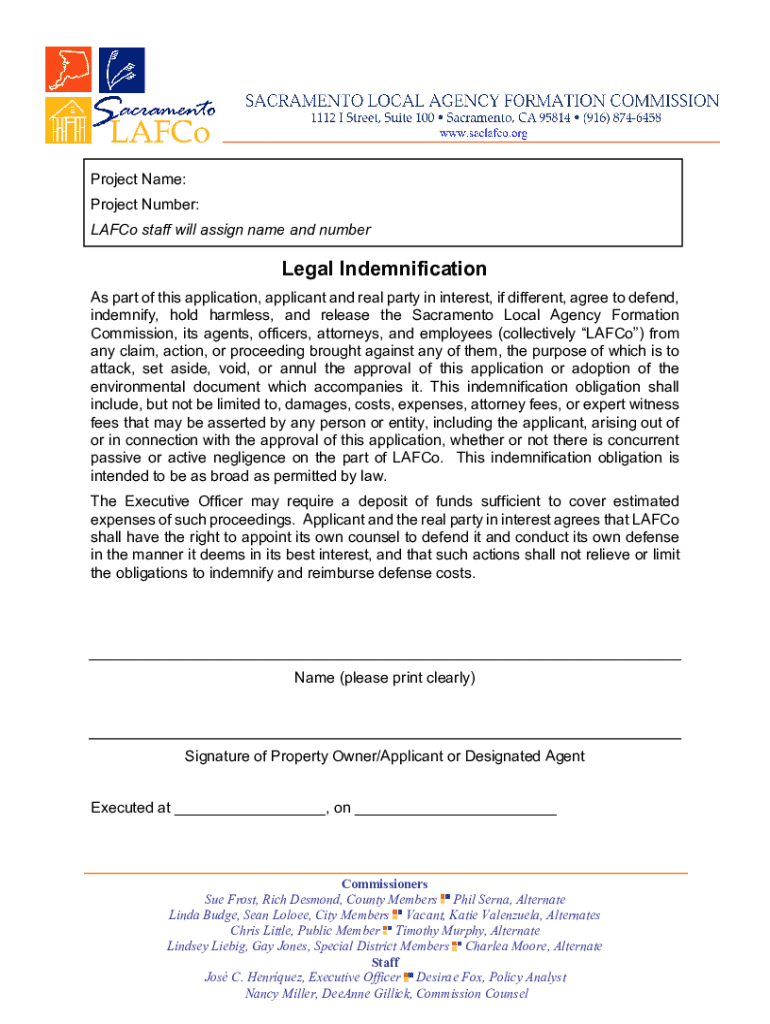 Project Name: Project Number: LAFCo staff will assign name and numberLegal Indemnification As part of this application, applicant and real party in interest, if different, agree to defend, indemnify,
