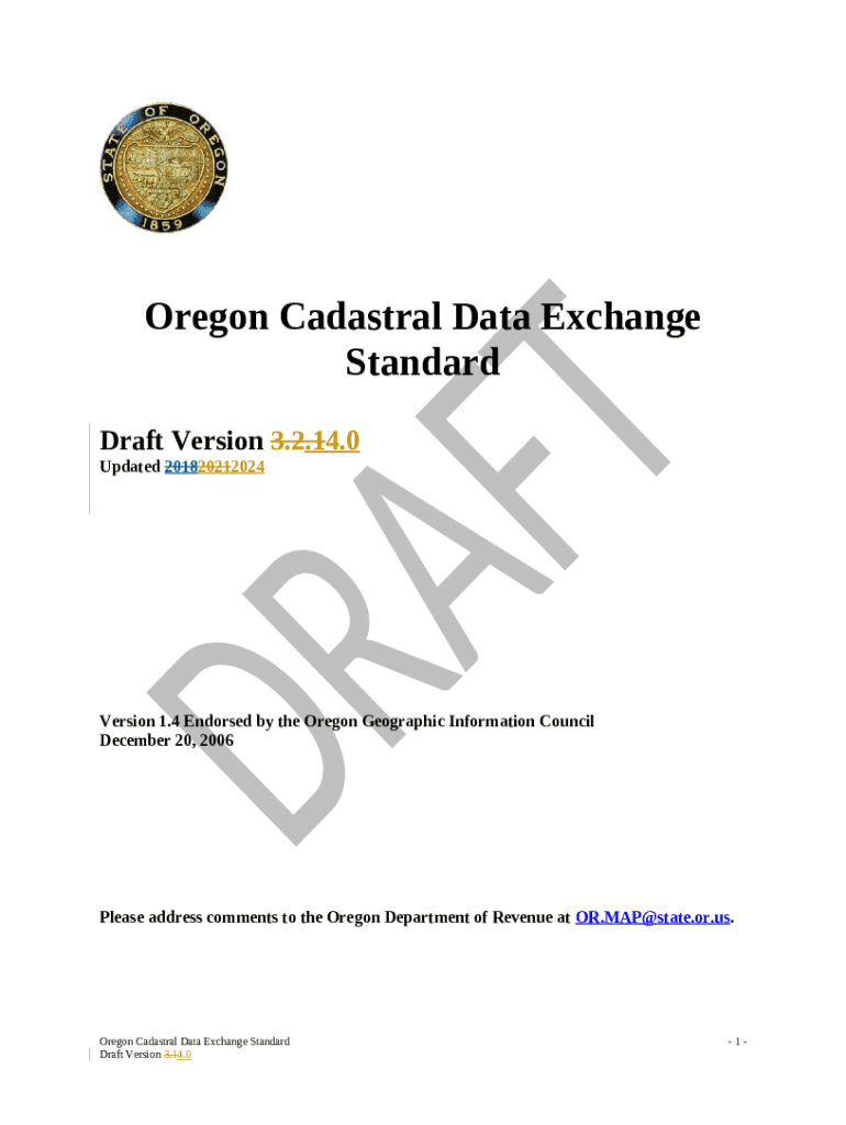 The Oregon Cadastral Data Exchange Standard is a fillable form in MS Word extension required to be submitted to the required address in order to provide certain info. It must be filled-out and signed, which is possible in hard copy, or with a certain software like PDFfiller. It allows to complete any PDF or Word document right in the web, customize it according to your purposes and put a legally-binding electronic signature. Once after completion, user can send the Oregon Cadastral Data Exchange Standard to the relevant recipient, or multiple ones via email or fax. The template is printable too because of PDFfiller feature and options offered for printing out adjustment. Both in electronic and in hard copy, your form should have a clean and professional look. It's also possible to turn it into a template for further use, so you don't need to create a new document from scratch. All that needed is to customize the ready document.