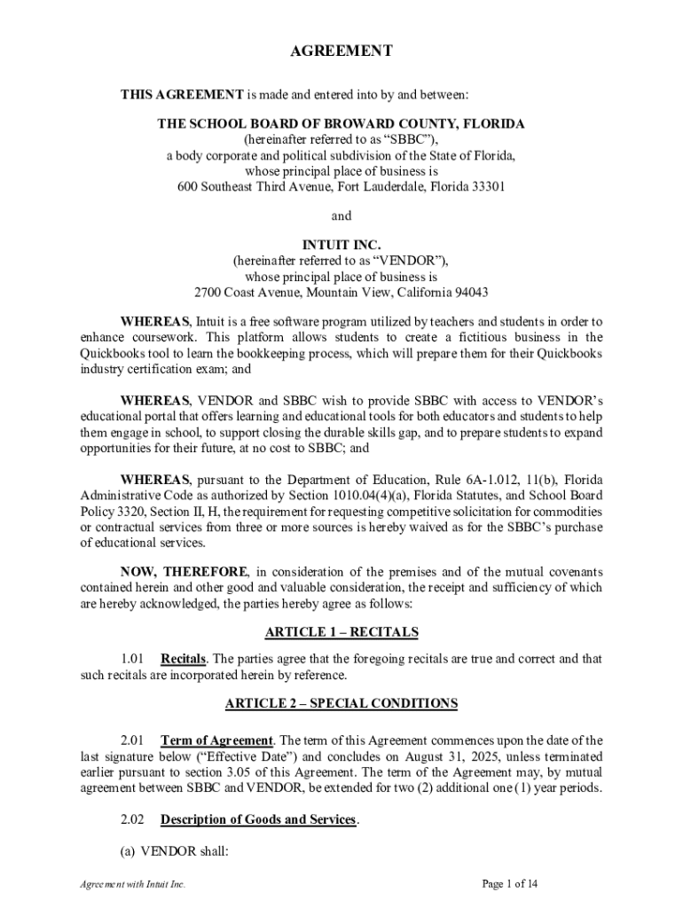 AGREEMENT THIS AGREEMENT is made and entered into by and between: THE SCHOOL BOARD OF BROWARD COUNTY, FLORIDA (hereinafter referred to as SBBC), a body corporate and political subdivision of the State