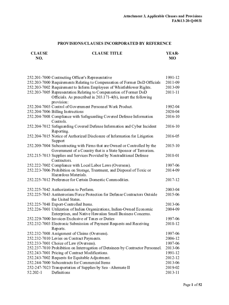 Attachment 3, Applicable Clauses and Provisions FA561320Q0031PROVISIONS/CLAUSES INCORPORATED BY REFERENCE CLAUSE NO.CLAUSE TITLEYEARMO252.2017000 252.2037000 252.2037002 252.2037005Contracting Officer\'s