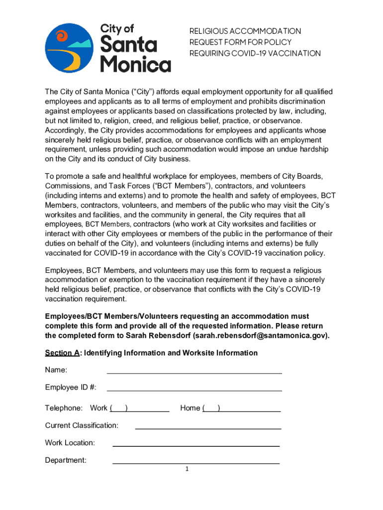 RELIGIOUS ACCOMMODATION REQUEST FORM FOR POLICY REQUIRING COVID19 VACCINATIONThe City of Santa Monica (City) affords equal employment opportunity for all qualified employees and applicants as to all