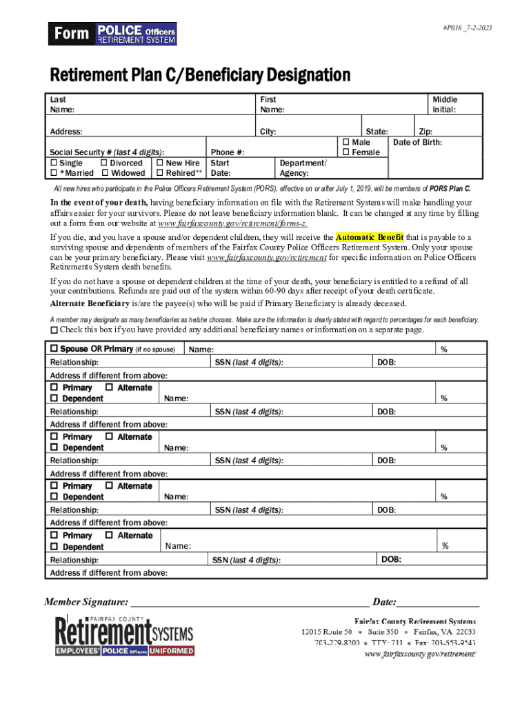 Form#P016 _722023Retirement Plan C/Beneficiary Designation Last Name:First Name:Address:City:Social Security # (last 4 digits): Single Divorced New Hire *Married Widowed Rehired**Phone #: Start Date:Middle Initial: State: Zip: Male Date of Birth: FemaleDepartment/ Agency:All new hires who participate in the Police Officers Retirement System (PORS), effective on or after July 1, 2019, will be members of PORS Plan C.In the event of your death,