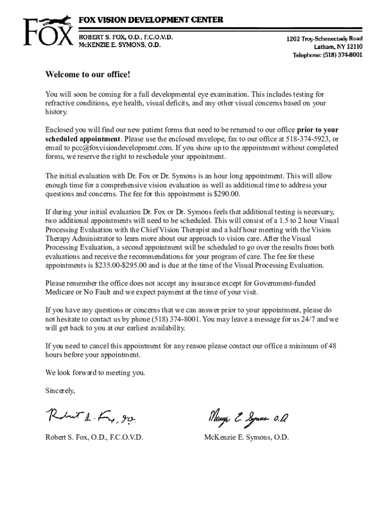 Welcome to our office! You will soon be coming for a full developmental eye examination. This includes testing for refractive conditions, eye health, visual deficits, and any other visual concerns