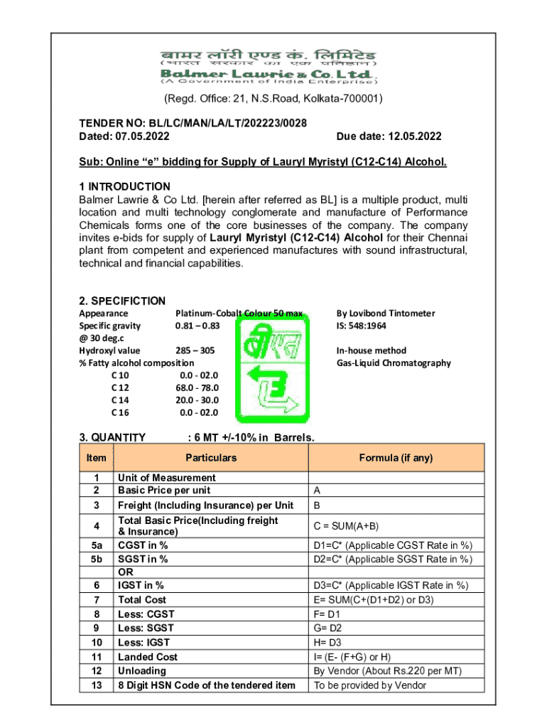 Dated: 07.05.2022Due date: 12.05.2022Sub: Online e bidding for Supply of Laurel Bristol (C12C14) Alcohol.