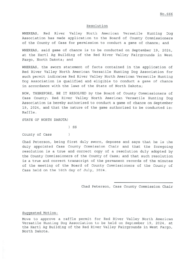 No.666ResolutionRedWHEREAS,Association ofthehasHartltheRed RiverValleyNOW,iswithTHEREFORE,Cass19,betoVersatileBoardofconductRiverRedoffactsCountyagamechance;and19,2024,inFairgroundsValleyDogCommissionersofSeptemberonconductedHuntingWestAmericanVersatileRed