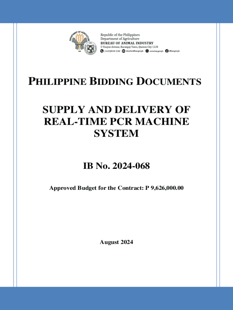 PHILIPPINE BIDDING DOCUMENTS SUPPLY AND DELIVERY OF REALTIME PCR MACHINE SYSTEM IB No. 2024068 Approved Budget for the Contract: P 9,626,000.00August 20240Preface These Philippine Bidding Documents