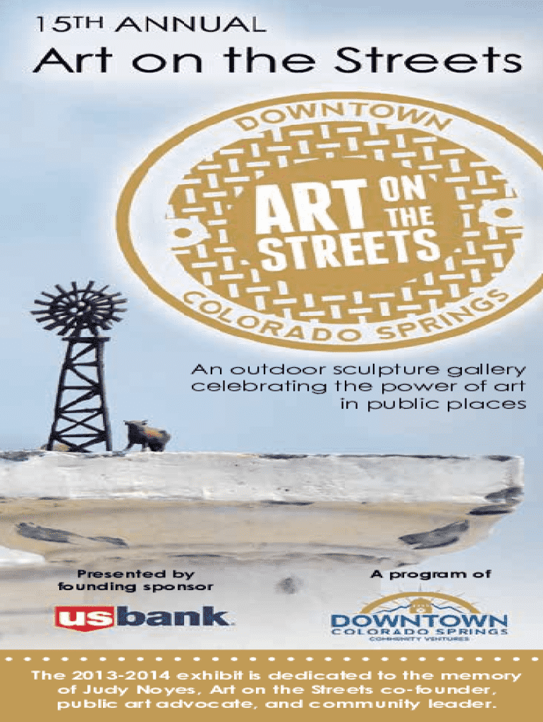 An outdoor sculpture gallery celebrating the power of art in public placesPresented by founding sponsorA program ofThe 20132014 exhibit is dedicated to the memory of Judy Noyes, Art on the Streets cofounder, public art advocate, and community leader.1BIJOUNEVADATEJONCASCADE10WEBERNEVADA9TEJONCASCADEVERMIJO COSTILLA CIMARRON 11PLATTE 2WEBERNEVADAIron Horse, Janene DiRicoCable Play Date, Melanie BIJOU Piech Constellations III,Chris Rench 4 3 KIOWA Red Springs