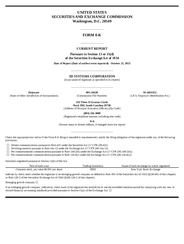 How to fill out On October 25, 2023, 3D Systems Corporation (the Company) issued a press release announcing certain preliminary financial results for the third quarter ended September 30, 2023 (the Press Release)