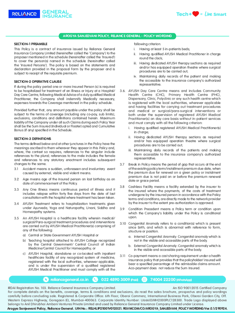 AROGYA SANJEEVANI POLICY, RELIANCE GENERAL POLICY WORDING SECTION1 PREAMBLEfollowing criterion:This Policy is a contract of insurance issued by Reliance General Insurance Company Limited (hereinafter called the \'Company\') to the proposer mentioned in the schedule (hereinafter called the \'Insured\') to cover the person(s) named in the schedule (hereinafter called the \'Insured Persons\'). The policy is based on the statements and declaration provided in the proposal Form by the proposer and...