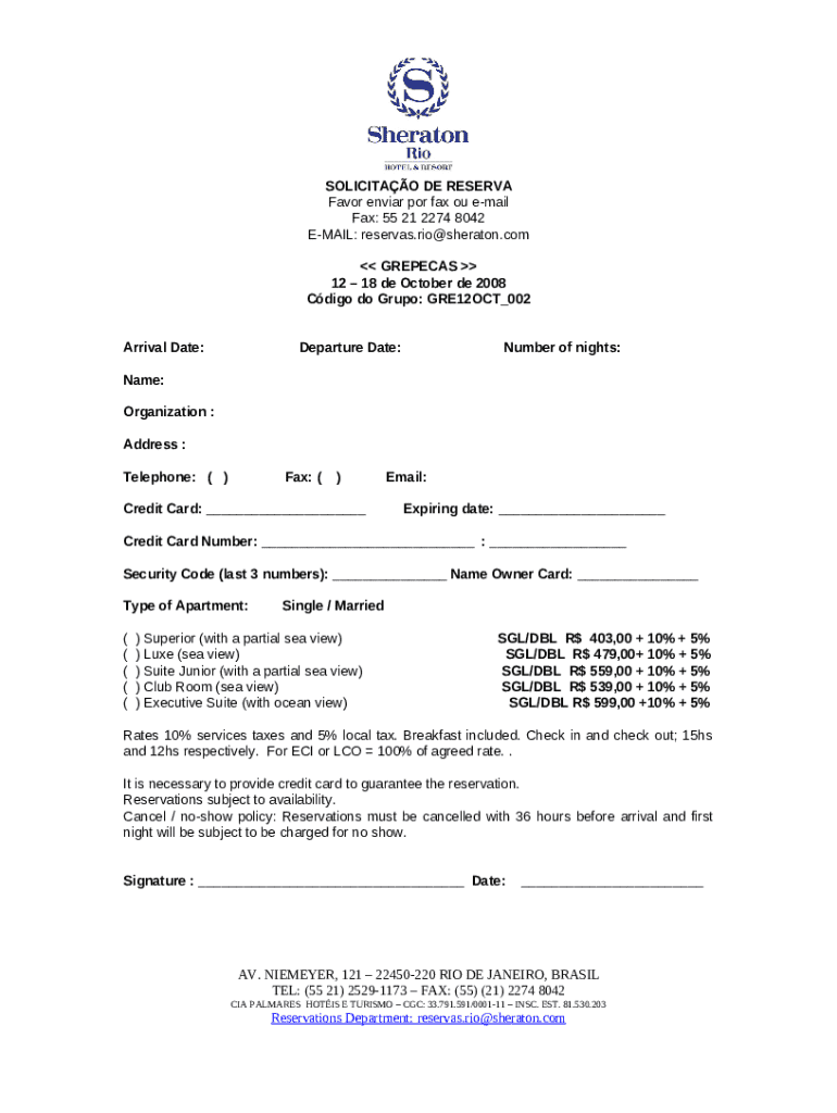 The Beach Resort Rio De JaneiroSheraton Grand Rio Hotel ... is a fillable form in MS Word extension which can be completed and signed for certain purposes. Then, it is provided to the relevant addressee in order to provide specific information and data. The completion and signing may be done in hard copy or with a suitable service e. g. PDFfiller. These applications help to complete any PDF or Word file without printing them out. It also allows you to edit its appearance for the needs you have and put a legal e-signature. Upon finishing, you send the Beach Resort Rio De JaneiroSheraton Grand Rio Hotel ... to the recipient or several of them by email and even fax. PDFfiller provides a feature and options that make your blank printable. It offers different settings when printing out. It does no matter how you will deliver a document - physically or by email - it will always look professional and firm. In order not to create a new writable document from scratch over and over, turn the original Word file into a template. After that, you will have a customizable sample.