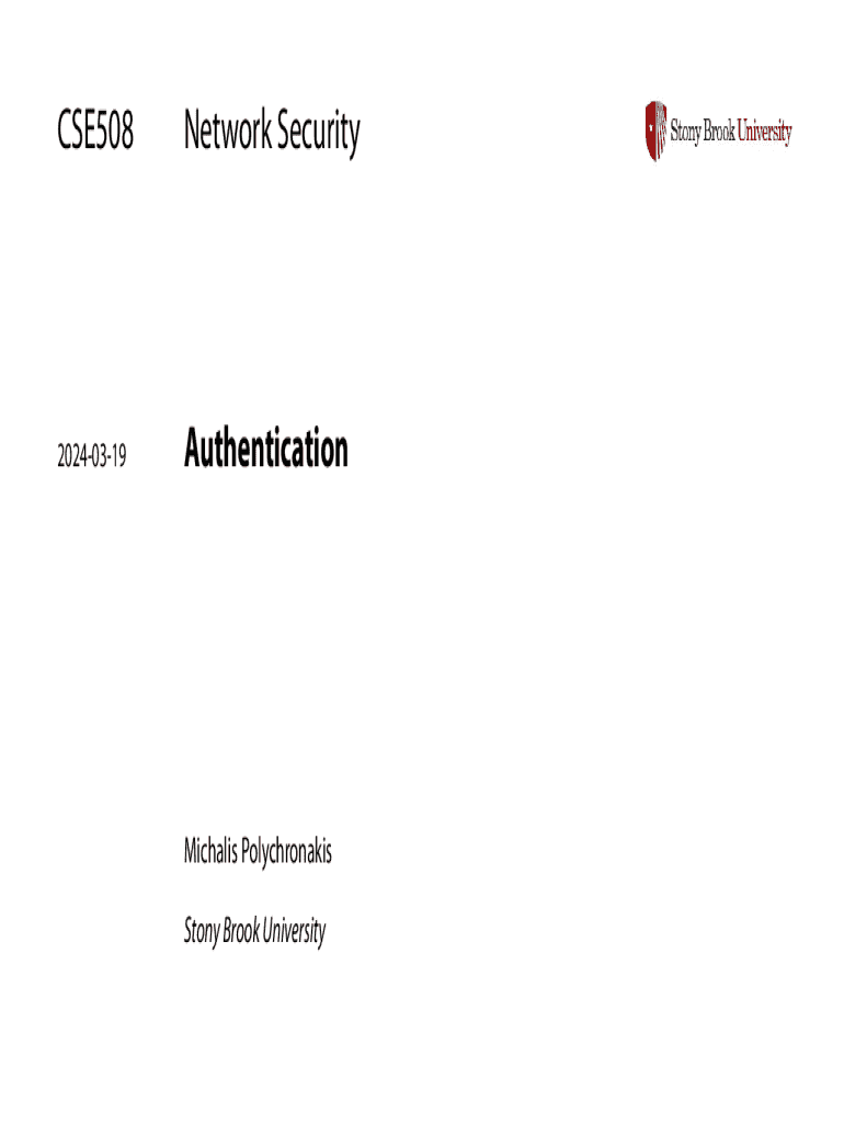 CSE508Network Security20240319AuthenticationMichalis Polychronakis Stony Brook UniversityAuthentication The process of verifying someones identity or role User, device, service, request, What is identity? Which characteristics uniquely identify an entity?Authentication is a critical service Enables communicating parties to verify the identity of their peers Many other security mechanisms rely on itTwo main types Human to computer Computer to computer 2Credentials Evidence