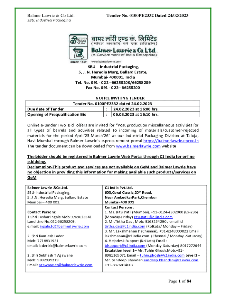 Balmer Lawrie & Co Ltd.Tender No. 0100PE2332 Dated 24/02/2023SBU: Industrial PackagingSBU Industrial Packaging, 5, J. N. Heredia Marg, Ballard Estate, Mumbai 400001, India Tel. No. 091 022 66258208/66258209 Fax No. 091 022 66258200 NOTICE INVITING TENDER Tender No. 0100PE2332 dated 24.02.2023 Due date of Tender : 24.02.2023 at 16:00 hrs. Opening of Prequalification Bid : 06.03.2023 at 16:10 hrs. Online etender Two Bid offers are invited for Post production miscellaneous activities